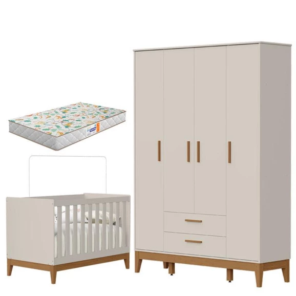 Guarda Roupa Infantil 4 Portas com Berço Americano Flip Areia Acetinado com Colchão Gazin- Reller
