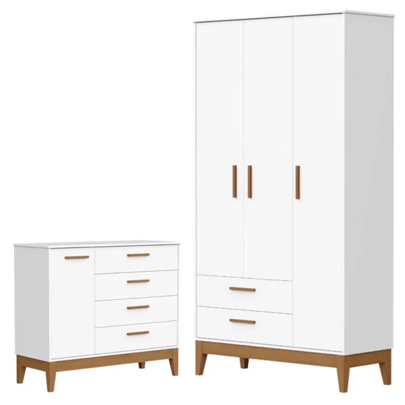 O Conjunto Infantil Flip da Reller une praticidade, organização e design moderno para o quarto do bebê ou da criança. Com acabamento em Branco acetinado, o conjunto é elegante, versátil e combina facilmente com diferentes estilos de decoração. Guarda-Roupa Infantil Flip 3 Portas projetado para manter tudo sempre no lugar, conta com cabideiro metálico para pendurar roupas, nichos internos que facilitam a organização e puxadores em MDF revestido que trazem um toque de sofisticação .Cômoda Infantil Sapateira Flip com gavetas amplas e funcionais, a cômoda é ideal para guardar roupinhas, acessórios e objetos do dia a dia. As corrediças telescópicas proporcionam abertura suave e silenciosa, enquanto os pés em madeira reforçam a estabilidade do móvel. Desenvolvido pela Reller com toda qualida de para você.