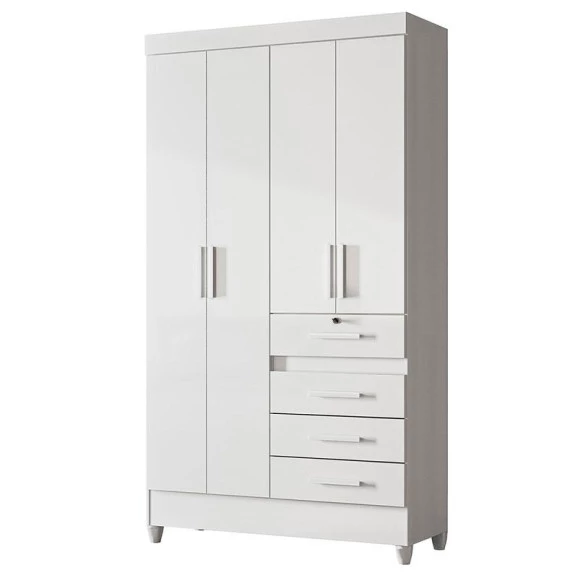 Começou a montar o quarto do seu filho? Então apresentamos para você este belo guarda roupa da linha Sobral. Com o inovador sistema flex, pode escolher as opções ndas cores na hora da montagem: branco/ rosa/ azul/ lilás, garantindo uma combinação perfeita no ambiente. Com quatro portas e quatro gavetas equipadas com corrediças metálicas, sendo a primeira com chave para maior segurança. Oferece um amplo espaço interno para acomodar as roupinhas e acessórios do seu pequeno. Os puxadores em MDF dão um design sofisticado, enquanto os pés em PVC proporcionam mais estabilidade e durabilidade. Fabricado pela Moval, é desenvolvido em MDP de qualidade. Sendo perfeito para quem busca praticidade e organização para compor o quarto do seu filho, aproveite!