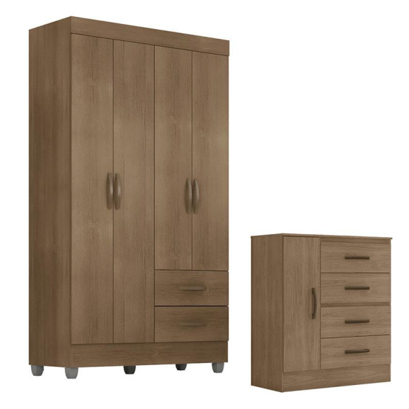 Guarda Roupa Solteiro 4 Portas e Cômoda 4 Gavetas e 1 Porta Lite Carvalho Oak – Móveis Leão