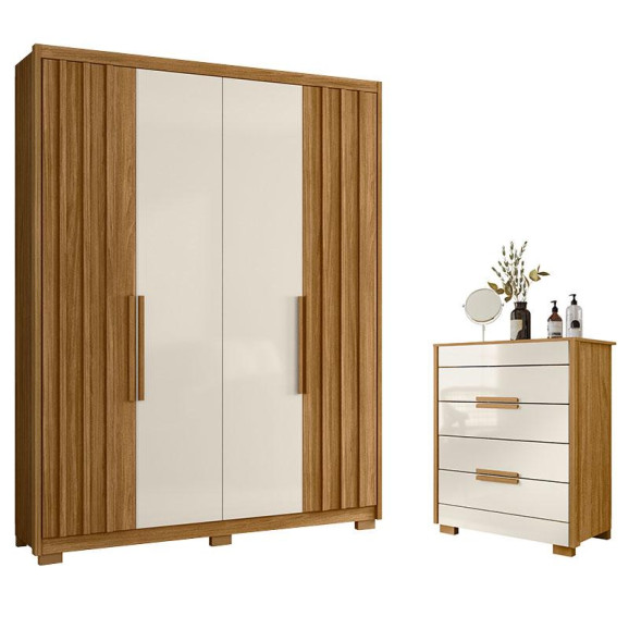 Está procurando móveis para seu quarto? Apresentamos para você este belo conjunto composto pelo guarda roupa da linha Califórnia e a cômoda da linha Dhara. O guarda roupa conta com quatro portas, sendo duas com detalhes ripados em MDF. O destaque é as duas opções na hora de montagem das portas, ficando ao seu gosto e três gavetas internas. A cômoda complementa o conjunto, com quatro gavetas espaçosas. Tanto o guarda roupa, quanto a cômoda possuem corrediças telescópicas, puxadores em MDF e pés em PVC trazendo mais estabilidade e resistência. Fabricados pela Moval, são desenvolvidos em MDP de alta qualidade, sendo perfeito para quem procura praticidade, durabilidade e um toque de modernidade para compor o quarto. Aproveite e garanta já o seu!