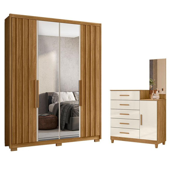 Está montando seu quarto? Apresentamos para você este belo conjunto composto pelo guarda roupa da linha Califórnia e a cômoda da linha Lisboa. O guarda roupa possui quatro portas, sendo as duas portas centrais com espelho. Conta ainda com três gavetas internas equipadas com corrediças telescópicas. Complementando o conjunto, a cômoda possui uma porta, além de cinco gavetas com corrediças metálicas. O destaque é o seu painel com espelho. Tanto o guarda roupa, quanto a cômoda possuem puxadores em MDF e pés em PVC entregando mais firmeza e durabilidade. Fabricados pela Moval, são desenvolvidos em MDP de qualidade. Ideal para quartos mais compactos, aliando design moderno, praticidade e resistência. Aproveite e garanta já o seu!