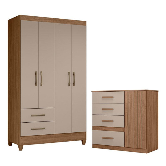 Organize seu quarto com elegância e o melhor custo benefício do mercado. Apresentamos o Guarda Roupa Solteiro Chile e Cômoda Vênus fabricados pela Moval. Guarda Roupa com 04 portas e 02 gavetas com corrediças metálicas, puxadores na cor bronze, cabideiro em madeira para melhor organização interna, espaço ideal para roupas longas e pés em PVC. A cômoda possui 04 gavetas com corrediças metálicas, 01 porta com detalhe frisado, puxadores em MDF na cor bronze e um design moderno que combina com qualquer decoração. Fabricado com materiais de alta qualidade que garante resistência e durabilidade ao produto. Confira mais detalhes e aproveite!
