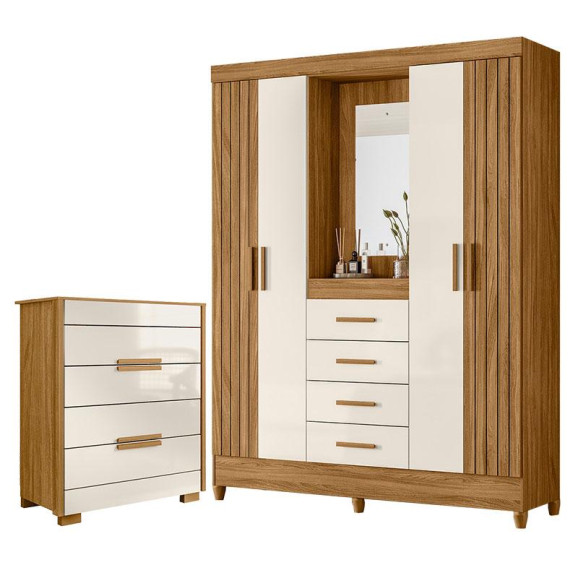 Organize seu quarto com elegância e o melhor custo benefício do mercado. Apresentamos o Guarda Roupa Solteiro Atenas e Cômoda Dhara fabricados pela Moval. Guarda Roupa possui quatro portas, quatro gavetas equipadas com corrediças metálicas, modelo com capelinha central com espelho, destacando o visual refinado e moderno, puxadores em MDF, cabideiros em alumínio para melhor organização interna e pés em PVC. A cômoda possui 04 gavetas com corrediças telescópicas, moldura lateral de 25mm, tampo de 15mm, puxadores em MDF e pés em PVC. Fabricado com materiais de alta qualidade que garante resistência e durabilidade ao produto. Confira mais detalhes e aproveite!