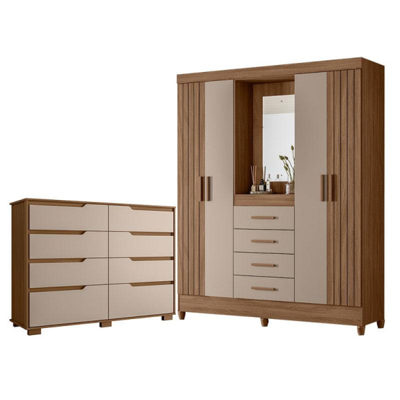 Organize seu quarto com elegância e o melhor custo benefício do mercado. Apresentamos o Guarda Roupa Solteiro Atenas e Cômoda Georgia fabricados pela Moval. Guarda Roupa possui quatro portas, quatro gavetas equipadas com corrediças metálicas, modelo com capelinha central com espelho, destacando o visual refinado e moderno, puxadores em MDF, cabideiros em alumínio para melhor organização interna e pés em PVC. A cômoda possui 08 gavetas com corrediças telescópicas, puxadores usinados e pés em PVC. Fabricado com materiais de alta qualidade que garante resistência e durabilidade ao produto. Confira mais detalhes e aproveite!