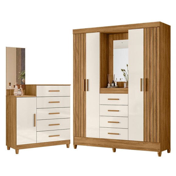 Guarda Roupa Solteiro com Espelho Atenas e Cômoda Lisboa Freijó Off White – Moval