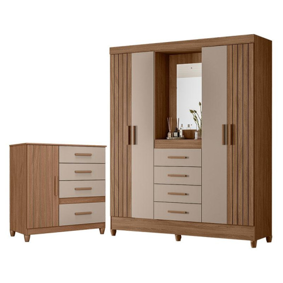 Organize seu quarto com elegância e o melhor custo benefício do mercado. Apresentamos o Guarda Roupa Solteiro Atenas e Cômoda Vênus fabricados pela Moval. Guarda Roupa possui quatro portas, quatro gavetas equipadas com corrediças metálicas, modelo com capelinha central com espelho, destacando o visual refinado e moderno, puxadores em MDF, cabideiros em alumínio para melhor organização interna e pés em PVC. A cômoda possui 04 gavetas com corrediças metálicas, 01 porta com detalhes frisados, pés em PVC e puxadores em MDF. Fabricado com materiais de alta qualidade que garante resistência e durabilidade ao produto. Confira mais detalhes e aproveite!