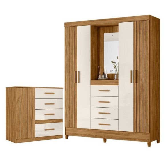Guarda Roupa Solteiro com Espelho Atenas e Cômoda Vênus Freijó Off White– Moval