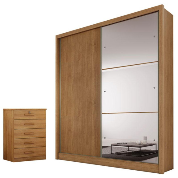 Procurando móveis para seu quarto? Transforme seu ambiente em um espaço mais organizado, prático e sofisticado com esse lindo conjunto fabricado pela Novo Horizonte. O guarda roupa da linha Dante possui 2 portas de correr, prateleiras bem distribuídas e gavetas equipadas com corrediças telescópicas garantindo mais qualidade e resistência. A cômoda gaveteiro da linha Suiça possui 5 gavetas oferecendo espaço extra para que seu quarto fique ainda mais organizado e aconchegante. Confira e aproveite, garanta já o seu!