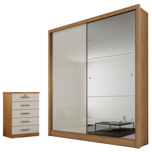 Procurando móveis para seu quarto? Transforme seu ambiente em um espaço mais organizado, prático e sofisticado com esse lindo conjunto fabricado pela Novo Horizonte. O guarda roupa da linha Dante possui 2 portas de correr, prateleiras bem distribuídas e gavetas equipadas com corrediças telescópicas garantindo mais qualidade e resistência. A cômoda gaveteiro da linha Suiça possui 5 gavetas oferecendo espaço extra para que seu quarto fique ainda mais organizado e aconchegante. Confira e aproveite, garanta já o seu!