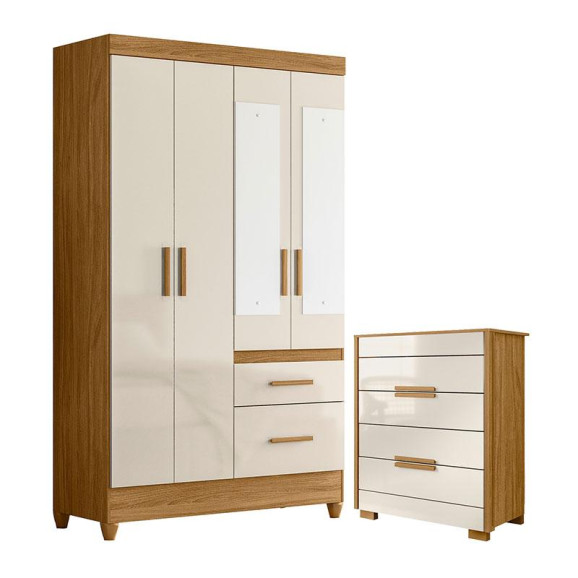 Guarda Roupa Solteiro Madri com espelho e Cômoda Dhara Freijó Off White – Moval