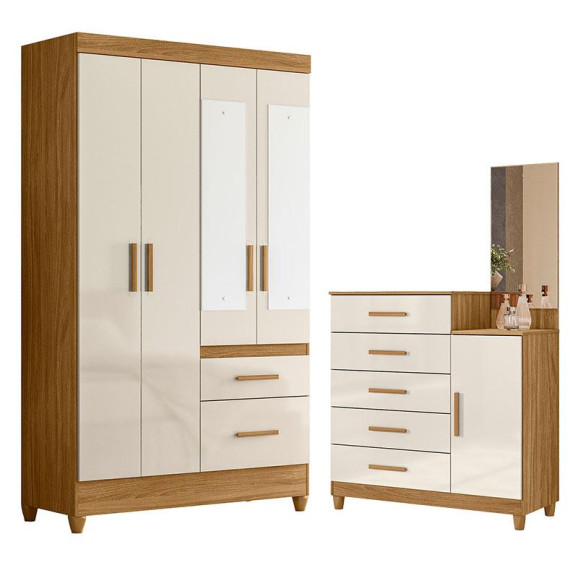 Guarda Roupa Solteiro Madri com espelho e Cômoda Lisboa Freijó Off White – Moval