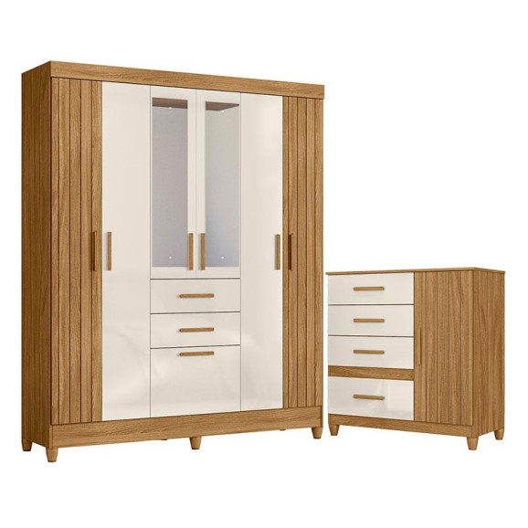 Guarda Roupa Solteiro Malta com Espelho e Cômoda Vênus com Pés Freijó Off White – Moval