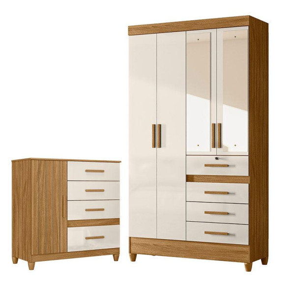 Guarda Roupa Solteiro Sobral com Espelho e Cômoda Vênus com pés Freijó Off White – Moval