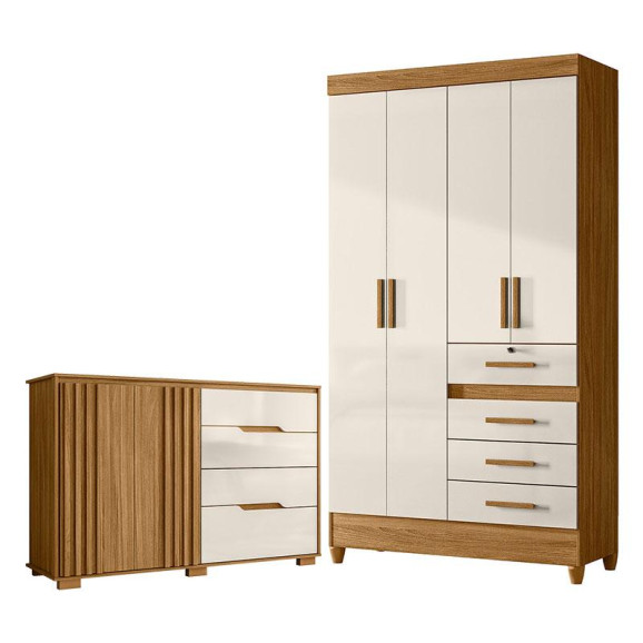 Está querendo renovar seu quarto com o melhor custo benefício do mercado. Apresentamos o Guarda Roupa Solteiro Sobral e Cômoda Texas fabricados pela Moval. Guarda Roupa possui 04 portas, 04 gavetas sendo a primeira com fechadura e chave ideal para guardar itens pessoais com segurança, corrediças metálicas, puxadores em MDF, cabideiros em alumínio para melhor organização interna e pés em PVC. A cômoda possui 04 gavetas com corrediças telescópicas, dobradiças 35mm com amortecedor, portas com detalhes ripados, puxadores usinados e pés em PVC. Fabricado com materiais de alta qualidade que garante resistência e durabilidade ao produto. Confira mais detalhes e aproveite!