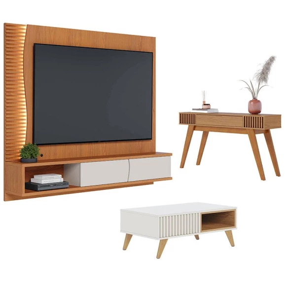 Home Suspenso Egeu Freijó Off White com Mesa de Centro Jeri Off White Freijó e Aparador Riviera Freijó – Colibri