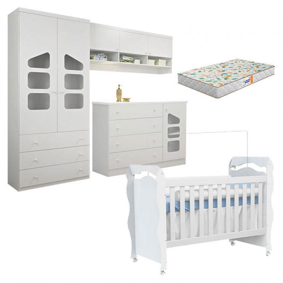 O bebê está chegando e você mamãe ainda não escolheu os móveis para montar o quartinho? Não se desespere, separamos para você uma variedade de produtos com alta qualidade deixando o ambiente com paisagem moderna e trazendo muito conforto nesse momento tão especial. Guarda Roupa Eloisa 2 Portas com Módulo Aéreo na cor Branco Brilho, um amplo espaço para facilitar na organização das roupinhas, Berço Americano New Nanda que transforma-se em Mini Cama aumentando a vida útil do móvel, Cômoda Eloisa Branco Brilho, possui 4 gavetas e 1 porta para melhor te auxiliar com os acessórios e sapatinhos do seu pequeno e ainda acompanha um lindo Colchão Gazin, para que as noites de sono do bebê sejam tranquilas. Confira!