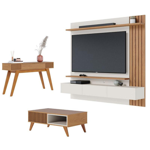 Painel para Tv Home Suspenso Juriti 1.8 Off White Matte Freijó com Mesa de Centro Jeri Freijó Off White e Aparador Riviera Freijó - Colibri