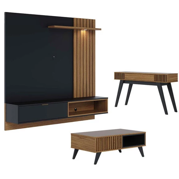 Painel para Tv Suspenso Tocantins 1.6 com Mesa de Centro Jeri e Aparador Riviera Preto Acetinado Noce Milano - Colibri