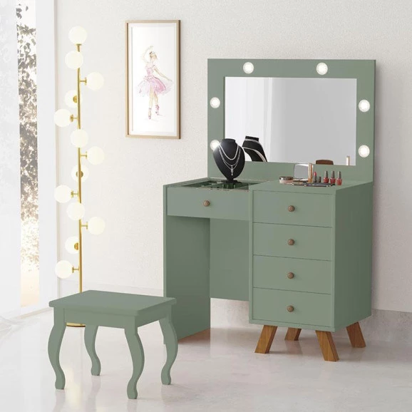 A Penteadeira Camarim Luna fabricada pela Luapa Móveis foi feita para renovar e modernizar seu ambiente, trazendo praticidade, organização e beleza para o seu dia a dia. A penteadeira possui 05 gavetas sendo 01 com colmeia organizadora, tampo de vidro e corrediças telescópicas, 06 leds integrados garantindo uma iluminação perfeita para maquiagem e cuidados diários, acompanha espelho e pés em madeira. Compre agora sua Penteadeira Camarim Luna Luapa e viva a experiência de se cuidar com estilo todos os dias!