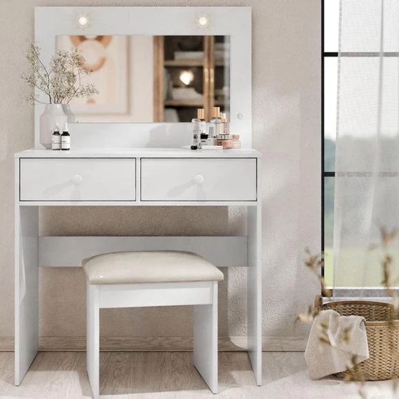 A Penteadeira Camarim Maia fabricada pela Luapa Móveis foi desenvolvida para tornar seu autocuidado ainda mais especial, sendo um móvel ideal para quem busca praticidade, elegância e sofisticação. A penteadeira possui 02 gavetas sendo 01 com nicho porta jóias com corrediças telescópicas, 02 leds integrados garantindo uma iluminação perfeita para maquiagem e cuidados diários, acompanha espelho, MDP 12mm no quadro e lateral de gavetas, restante todo 15mm e sapatas de plástico nas laterais para não ficar direto no chão. Compre agora sua Penteadeira Camarim Maia Luapa e viva a experiência de se cuidar com estilo todos os dias!