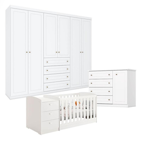 Quarto Americano 6 Portas com Berço Multifuncional Atlanta Branco Fosco Henn - Reller