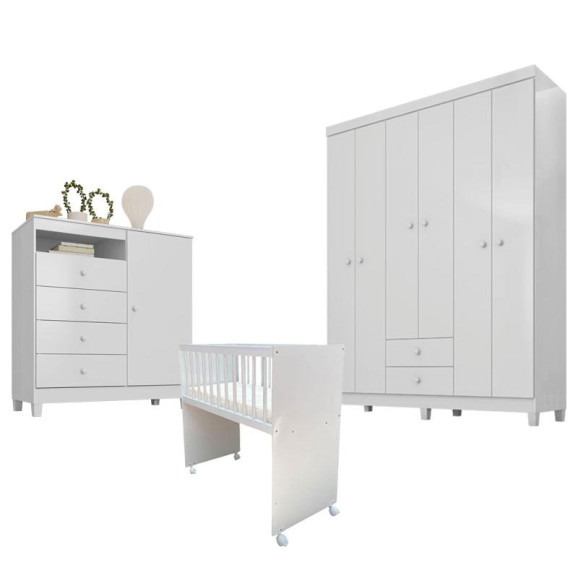 Esta procurando móveis para o quartinho do seu bebê? Aqui você encontra qualidade com bom preço! Apresentamos esse lindo conjunto composto pelo Mini Berço Moisés Alegria e Cômoda Gaveteiro e Guarda roupa da linha Ternura desenvolvidos com materiais de excelente qualidade e procedência em MDP. O berço é portátil Ideal para a mamãe ficar pertinho do seu bebê na rotina do dia a dia. Para facilitar a locomoção possui rodízios com trava garantindo mais segurança. Já acompanha o colchão. A cômoda e o guarda roupa possuí amplo espaço interno, repartições ideal para acomodar roupinha sapatinhos, e outros acessórios do bebê. Conforto e segurança que seu bebê merece aproveite e garanta já o seu!