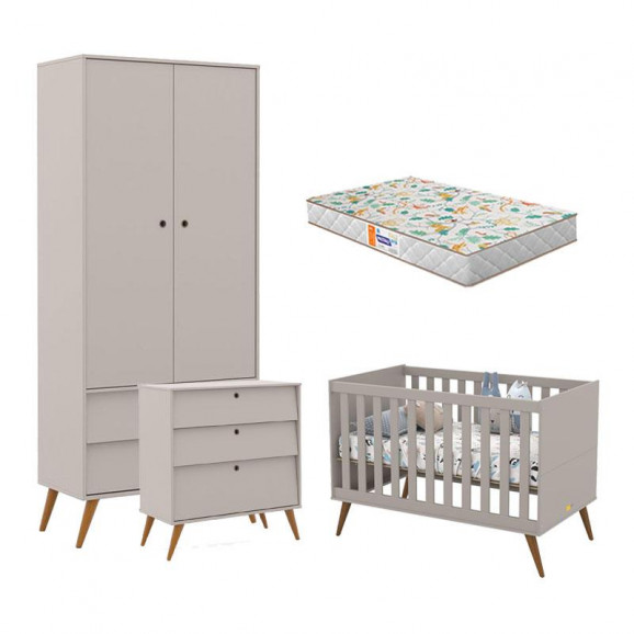 Quarto de Bebê 2 Portas e Cômoda Gaveteiro Retro Gold Cinza Eco Wood com Colchão Gazin – Matic