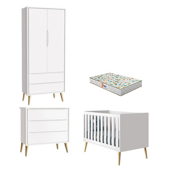 Quarto de Bebê 2 Portas e Cômoda Gaveteiro Theo Branco Pés Madeira Natural com Colchão Gazin – Reller
