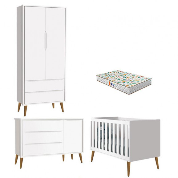 Quarto de Bebê 2 Portas Theo Branco Pés Amadeirados com Colchão Gazin – Reller