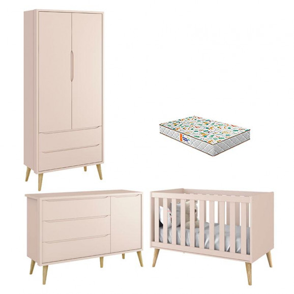 Quarto de Bebê 2 Portas Theo Rosa Pés Madeira Natural com Colchão Gazin – Reller