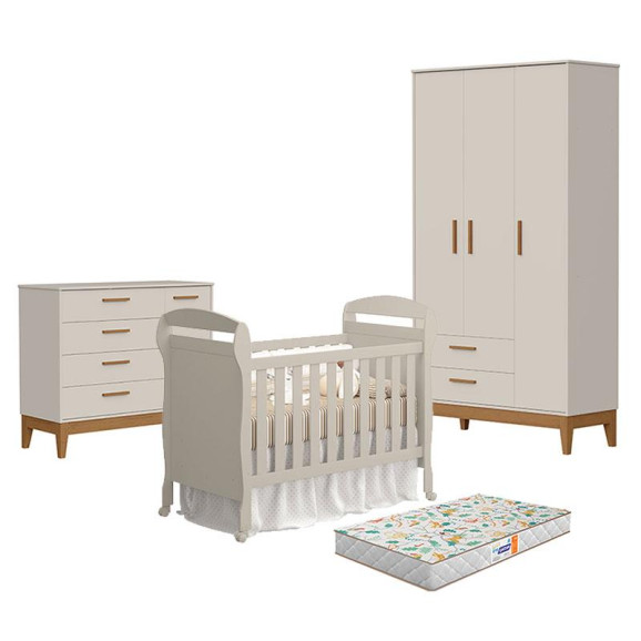 O Quarto de Bebê 3 Portas com Cômoda com Porta Flip e Berço Americano Danny Areia Acetinado com Colchão Gazin - Reller é a escolha ideal para um ambiente completo, elegante e funcional. Com acabamento sofisticado em areia acetinado, o conjunto oferece berço seguro e confortável com colchão Gazin para noites tranquilas, além de guarda-roupa 3 portas espaçoso e cômoda com porta flip que garantem organização prática no dia a dia. Um quarto harmonioso, moderno e cheio de aconchego para receber o seu bebê.