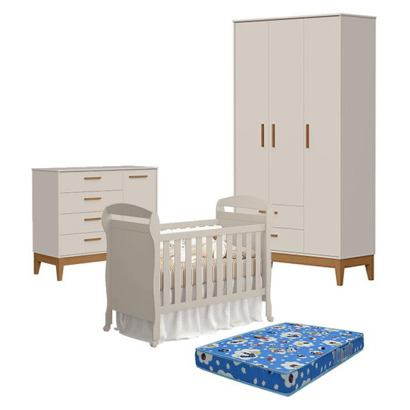 Quarto de Bebê 3 Portas com Cômoda com Porta Flip e Berço Americano Danny Areia Acetinado com Colchão Ortobom - Reller
