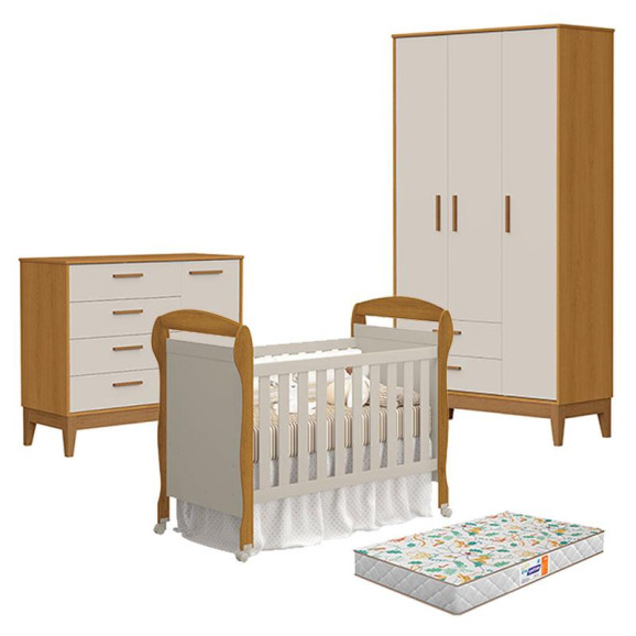 Quarto de Bebê 3 Portas com Cômoda com Porta Flip e Berço Americano Danny Areia Savana Acetinado com Colchão Gazin - Reller