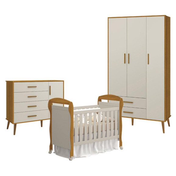 Quarto de Bebê 3 Portas com Cômoda com Porta Isis e Berço Americano Danny Areia Savana Acetinado - Reller