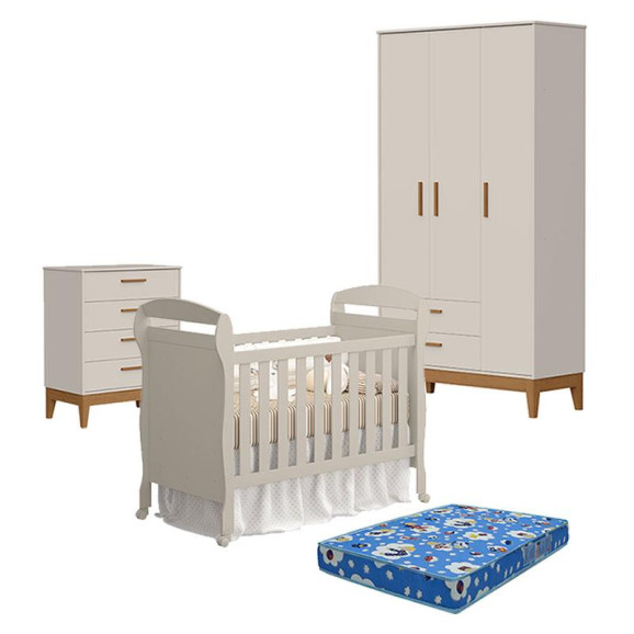O Quarto de Bebê 3 Portas com Cômoda com Porta Flip e Berço Americano Danny Areia Acetinado com Colchão Tend Tudo - Reller é a solução completa para um ambiente elegante, funcional e acolhedor. Com acabamento sofisticado em areia acetinado, o berço oferece segurança e conforto, acompanhado do colchão Tend Tudo que proporciona noites tranquilas. O guarda-roupa 3 portas e a cômoda com porta flip garantem amplo espaço e organização prática, criando um quarto moderno e cheio de charme para o seu bebê.