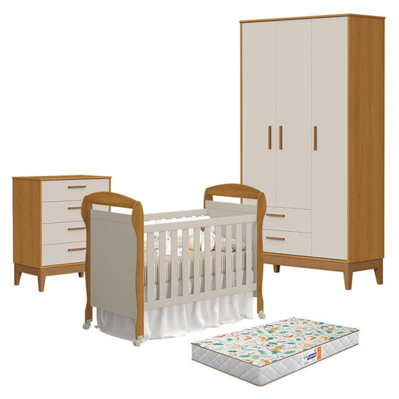Quarto de Bebê 3 Portas com Cômoda Gaveteiro Flip e Berço Americano Danny Areia Savana Acetinado com Colchão Gazin - Reller