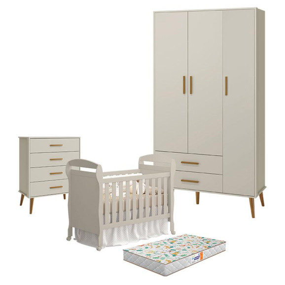 Quarto de Bebê 3 Portas com Cômoda Gaveteiro Isis e Berço Americano Danny Areia Acetinado com Colchão Gazin - Reller