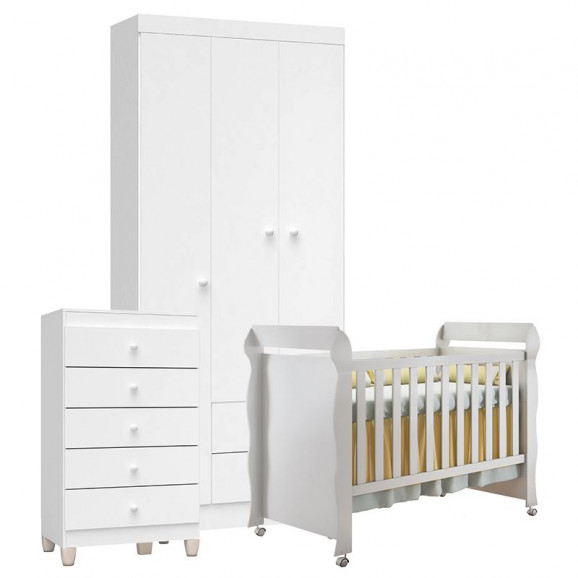 Quarto de Bebê 3 Portas com Gaveteiro Ternura Baby e Berço Mirelle Branco Brilho - Incorplac