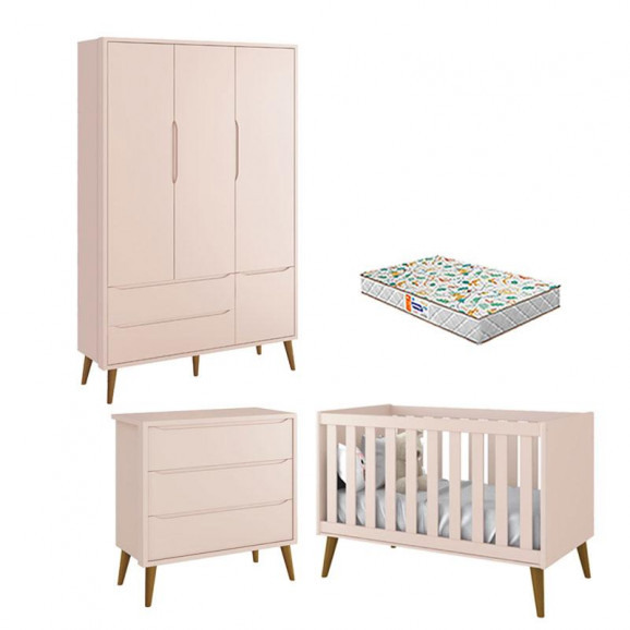 Quarto de Bebê 3 Portas e Cômoda Gaveteiro Theo Rosa Pés Amadeirados com Colchão Gazin – Reller