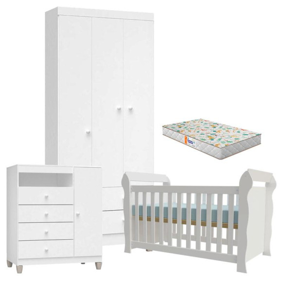 Quarto de Bebê 3 Portas com Gaveteiro Ternura Baby e Berço Lara Branco Brilho com Colchão Gazin – Incorplac
