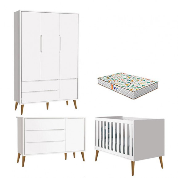 Quarto de Bebê 3 Portas Theo Branco Pés Amadeirados com Colchão Gazin – Reller