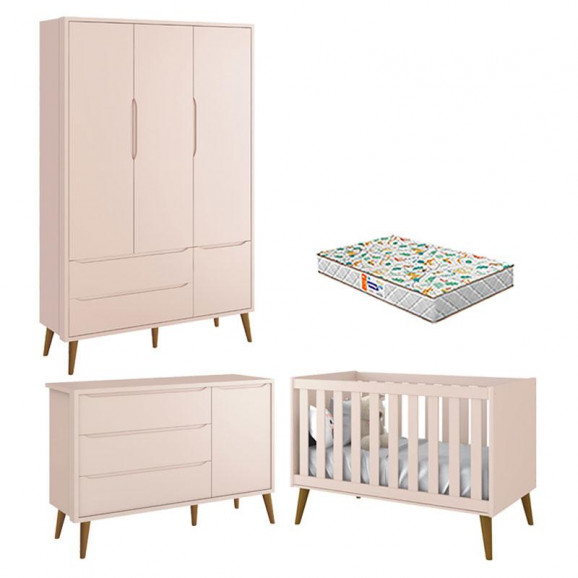Quarto de Bebê 3 Portas Theo Rosa Pés Amadeirados com Colchão Gazin – Reller