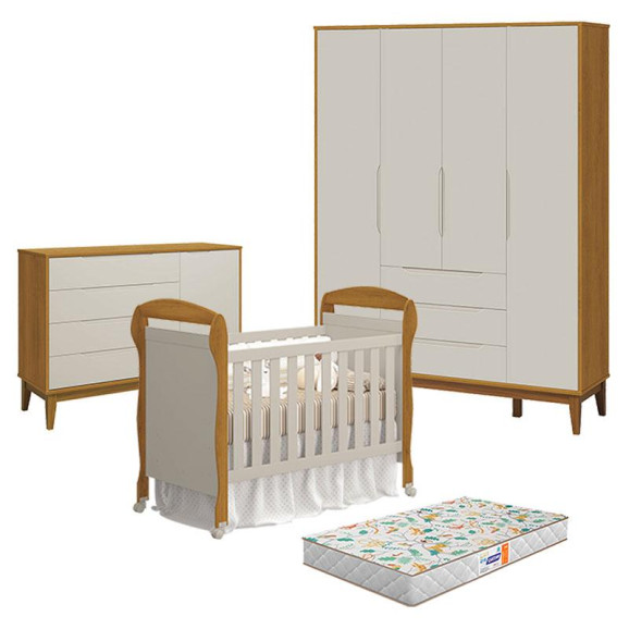 O Quarto de Bebê 4 Portas com Cômoda com Porta Elfe Classic e Berço Americano Danny Areia Savana Acetinado com Colchão Gazin - Reller é a escolha ideal para um ambiente completo, moderno e funcional. Com acabamento sofisticado em areia savana acetinado, o berço oferece conforto e segurança, acompanhado do colchão Gazin que garante noites tranquilas. O guarda-roupa 4 portas proporciona amplo espaço para organização, enquanto a cômoda com porta Elfe Classic traz praticidade no dia a dia, criando um quarto harmonioso, acolhedor e cheio de charme para o seu bebê.