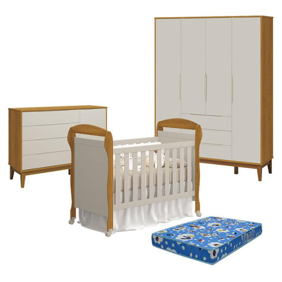 Quarto de Bebê 4 Portas com Cômoda com Porta Elfe Classic e Berço Americano Danny Areia Savana Acetinado Amadeirado com Colchão Ortobom - Reller