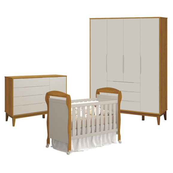 Quarto de Bebê 4 Portas com Cômoda com Porta Elfe Classic e Berço Americano Danny Areia Savana Acetinado Amadeirado - Reller