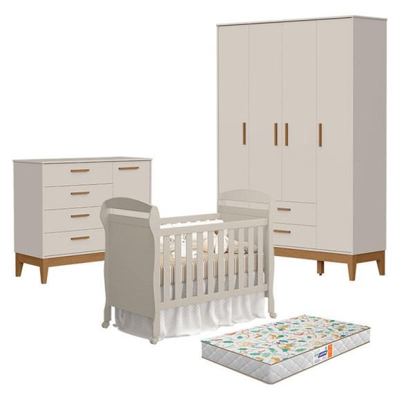 Quarto de Bebê 4 Portas com Cômoda com Porta Flip e Berço Americano Danny Areia Acetinado com Colchão Gazin - Reller