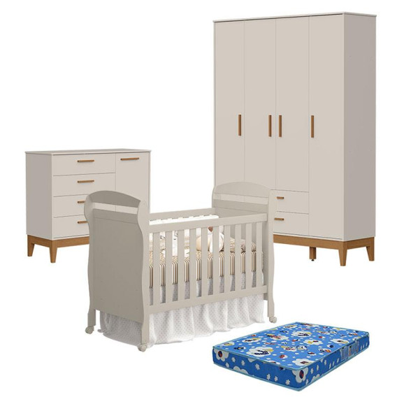 Quarto de Bebê 4 Portas com Cômoda com Porta Flip e Berço Americano Danny Areia Acetinado com Colchão Tend Tudo - Reller