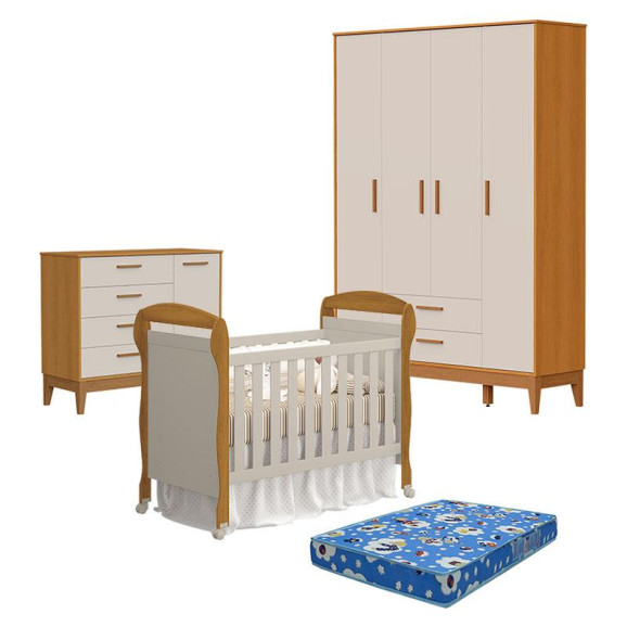 O Quarto de Bebê 4 Portas com Cômoda com Porta Flip e Berço Americano Danny Savana Areia Acetinado com Colchão Tend Tudo - Reller é a escolha ideal para um ambiente completo, funcional e acolhedor. Com acabamento elegante em areia savana acetinado, o berço proporciona segurança e conforto, acompanhado do colchão Tend Tudo que garante suporte ideal para noites tranquilas. O guarda-roupa 4 portas oferece amplo espaço para organização, enquanto a cômoda com porta flip traz praticidade no dia a dia, criando um quarto moderno, harmonioso e cheio de charme para o seu bebê.
