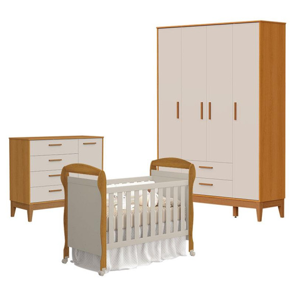 Quarto de Bebê 4 Portas com Cômoda com Porta Flip e Berço Americano Danny Areia Savana Acetinado - Reller